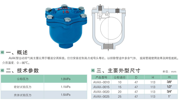 在一般情況下,水中約含2VOL%的溶解空氣,主輸水過程中,這些空氣由水中不斷地釋放出來,聚集在管線的高點(diǎn)處,形成空氣袋(AIR POCKET),使輸水變得困難,系統(tǒng)的輸水能力可因此下降約5-15%。此微量排氣閥主要功能就是排除這2VOL%的溶解空氣,并適合裝置于高層建筑,廠區(qū)內(nèi)配管,小型泵站用以保護(hù)或改善系 統(tǒng)的輸水效率及節(jié)約能源。