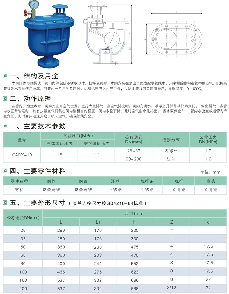 CARX復合式排氣閥閥體為圓桶狀,閥門內件包括不銹鋼球、閥桿及閥瓣。本閥安裝在泵出口處或送配水管線中,用來排除集積在管中的空氣,以提高管線及水泵的使用效率,當管內一旦產生負壓時,此閥迅速吸入外界空氣,以防止管線因負壓而損壞。