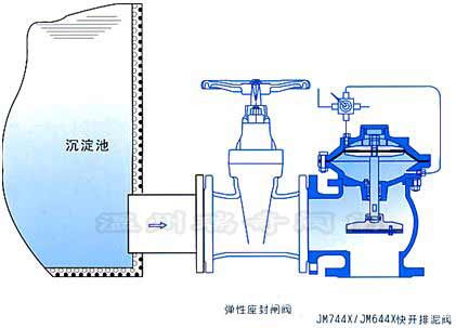 快開液動氣動排泥閥JM744X/JM644X,是一種由液壓源或氣動泊作執行機構的角型截斷類閥門。通常成排安裝在常常池底部外側壁,用以排除池底常常的泥砂和污物。該閥由尼龍強化橡膠隔膜將閥門分為兩啊腔室,接通液壓或氣動源,采用電動或手動二位四通換向閥控制,實現快速排泥。該閥將隔膜代替活塞,無運動摩擦,更適用于泥漿等顆粒介質,大大提高了閥門的使用壽命。